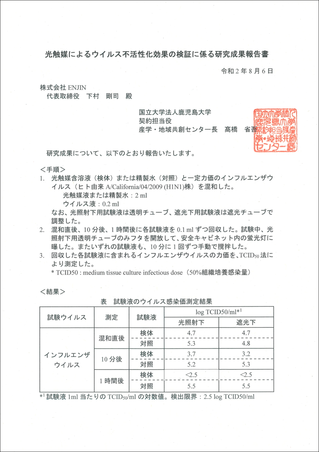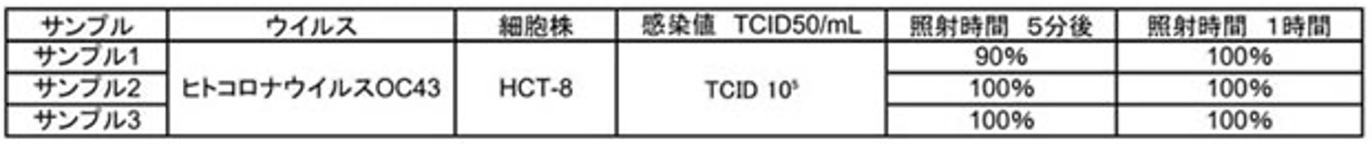 5分で90%以上、1時間で100%不活化するという顕著な結果が得られた。
